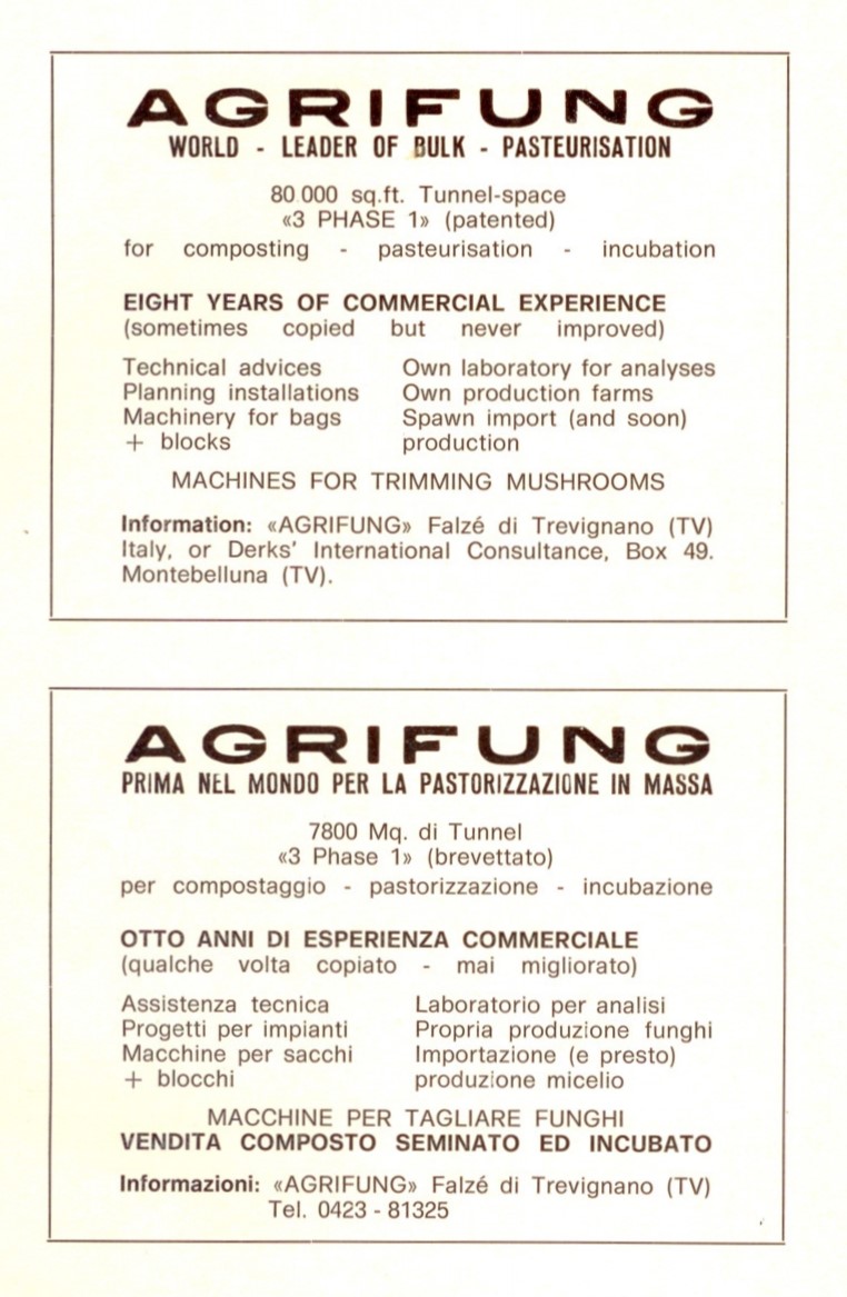 Nel 1973 l’innovativo modo di lavorazione permette ad Agrifung di affermandosi come leader nel settore in Italia e come punto di riferimento internazionale. Ottiene il brevetto e poco dopo viene presentato alla Conferenza dei Fungicultori inglesi che si tiene a Brighton. Nel giro di qualche anno, il metodo viene venduto in tutti i principali Paesi produttori di funghi, riscuotendo grande successo e consenso: dapprima in Gran Bretagna, Francia e Olanda, e successivamente negli Stati Uniti, in Messico, Canada, Australia e altri Paesi europei.